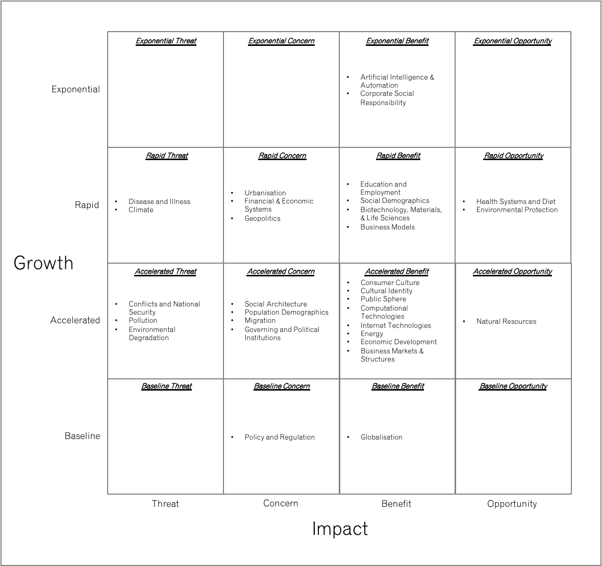 The horizontal axis plots impact: whether the force represents an opportunity or a threat to the firm, assessed through a combination of revenue exposure, competitive positioning, and capability alignment. The vertical axis plots momentum: how fast the force is growing, scored from baseline (growing at or below GDP rate) through accelerated and rapid to exponential (growing at 15% or more annually). The team arrives at a shared position for each force through structured discussion, typically with one member presenting a preliminary assessment and the group debating until consensus emerges. Voting can break deadlocks, but the conversation is where the value lies.