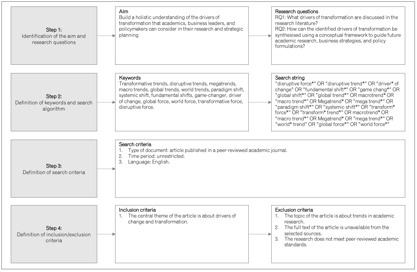 Third, I set strict selection rules. Only peer-reviewed work. Any time period. English language. Only articles where external change was the central focus.