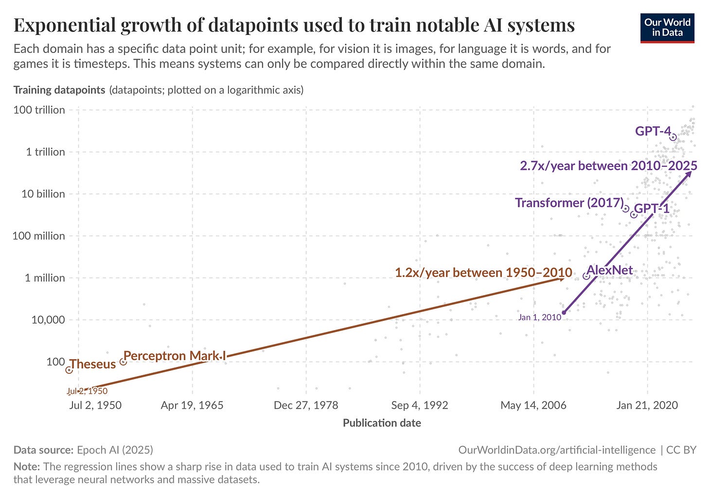 If you plot the amount of training data for notable AI systems over time on a logarithmic scale, you will see that the volume of training data for leading models has roughly doubled every nine or ten months. This shift in scale helps explain the change people feel when they use new AI tools.